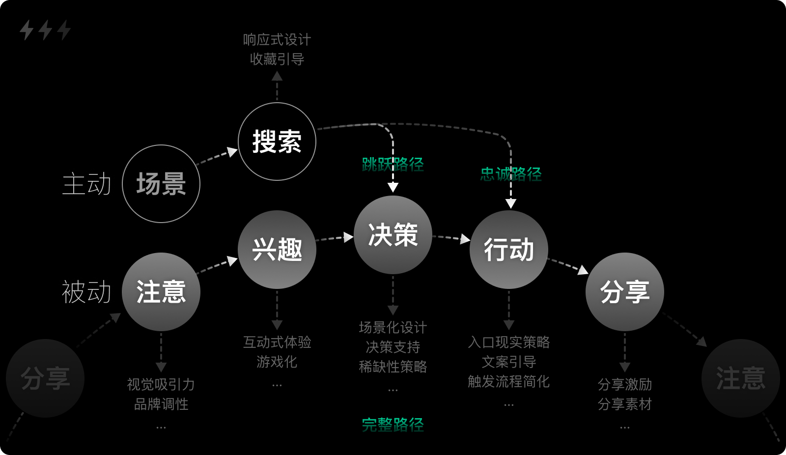 在充分借鉴多个模型的基础上,并结合线上用户和场景特点,梳理出一个我认为更符合数字消费者行为特点的决策模型。该模型同CDJ模型相似,采取环状流程,以主动型和被动型两类用户为出发点,由“完整路径”“跳跃路径”“忠诚路径”三个部分组成,包括了注意、兴趣、决策、行动和分享等五个关键节点。